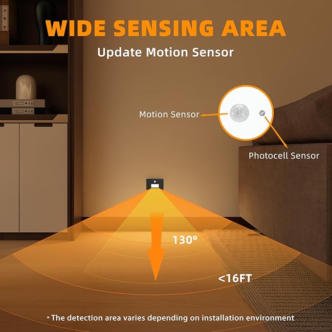 - Upgraded Motion Sensor Stair Lights: LED Stair light features both a motion sensor and a photocell sensor. In AUTO mode, the motion sensor step light turns on at night when motion is detected, stays on for 30 seconds, and then turns off. Stairway lights remain off during the day. In ON mode, stair lights indoors stay on continuously—great for stairway lighting, stairwell lighting, and both indoor and outdoor use.