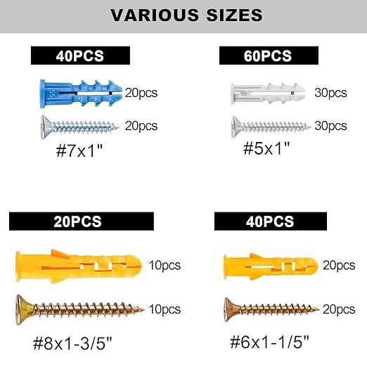 - VERSATILE SIZES FOR VARIOUS PROJECTS – This wall anchors and screws assortment kit includes five essential sizes (#6*1",#7*1",#6*1-1/5",#8*1-3/5") It works for all types of hanging installation needs, and pairs great with a drywall repair kit. the plastic wall anchors and Philips wood screws are neatly packed in a compact organizer box.