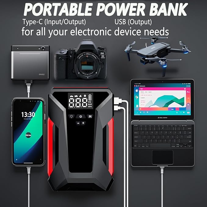- 【ULTRA CAPACITY POWER BANK】NEBULOUSDRIVE portable car jump starter with air compressor is also a portable power bank. Offers USB charging output port with Type-C charging input/output ports, its compact design ensures high portability, making it capable of efficiently charging various portable devices such as smartphones, tablets, cameras and more
