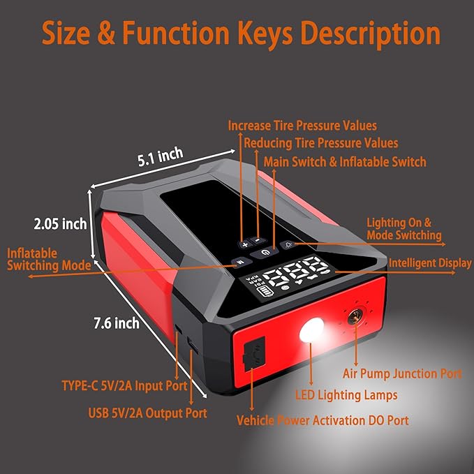 - 【NOTE】Please charge the jumper fully when you first time receive it, though it shows full power. It is suggested to start the car when power is greater than 75%. Please recharge the car jump pack every 2-3 months to activate the battery and prolong the lifespan of the portable jump starter.Should you have any questions post-purchase, our customer service is ready to assist you.Package Including 1 X jump starter with air compressor, 1 X smart jumper cable, 1 X type-c cable, 1 X carrying bag, 1 X pump tube, 3 X air nozzle, 1 X user manual