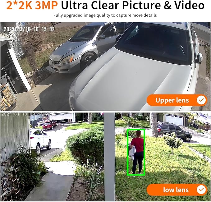 - 【1 Device = 2 Cameras,2K Ultra HD Resolution & Color Night Vision】Security Cameras Wireless Outdoor has two lens. 2 lens view cover 360°,Each lens is 3MP/2K with sharper colors and details, allowing you to see everything that is happening within your surveillance area. One camera but function as 2, double view coverage. The camera is built-in 8 leds, the light could be set to motion triggle on or always on at night or close,and when the lights are on at night, extraordinary color night vision adds a glow to every dark night.