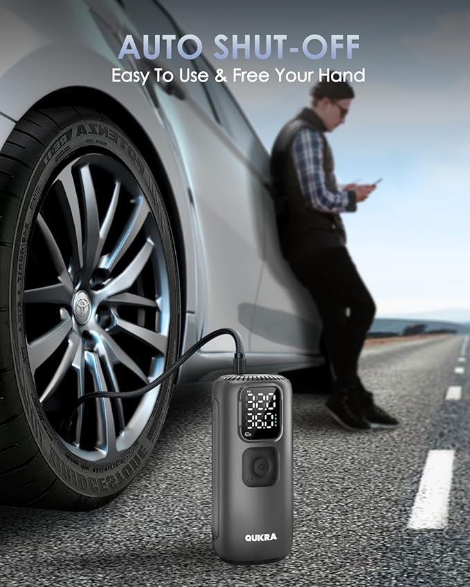 - [Auto Shut-off and Digital Display]: With real-time pressure monitoring, this portable air compressor automatically stops upon reaching your preset target pressure, delivering hands-free operation for effortless inflation. Set your target PSI, the smart air pump will handle the rest. During inflation, expect some heat buildup in the hose and metal connections, it's normal. Handle carefully to avoid burns when attaching or removing