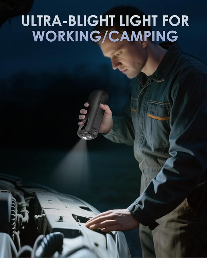 - [User-friendly Design]: This premium air pump contains multiple user-friendly designs: Dual-line LED display, high-brightness screen remains clearly visible even in strong sunlight. Three lighting modes include lighting, flash and SOS, meet diverse lighting demands. Multiple measurement units, supports PSI, bar, kPa, and other pressure units to meet global user needs. Anti-slip side grips, textured surfaces prevent slippage from sweaty hands during operation