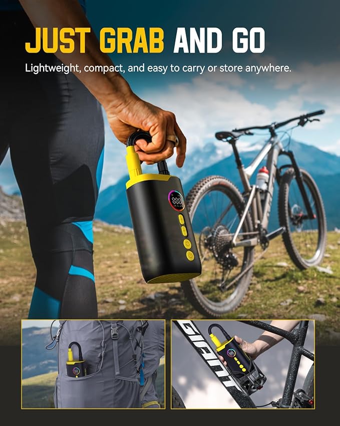 - 【Portable Air Compressor】Our car air compressor compact design (5.1*3.3*1.9 INCH, 1.12 LBS) with storage cloth bags, super lightweight and easy to carry. U-lock design very suit for hanging on bike. Letting you hit the road with peace of mind, at home, on road trips, or outdoor adventures, free from any delays.