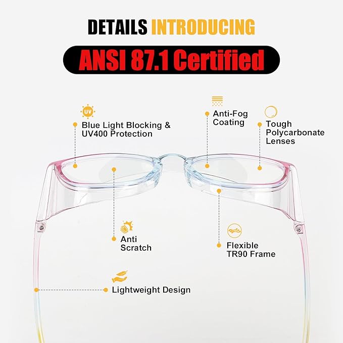 - Anti-Fog and Blue Light Blocking: Dual-sided anti-fog coating ensures clear vision even with masks, while blue light filtering technology reduces harmful emissions from screens and fluorescent lights, alleviating eye strain during prolonged use, UV400 protection ensures all-day eye protection glasses performance.