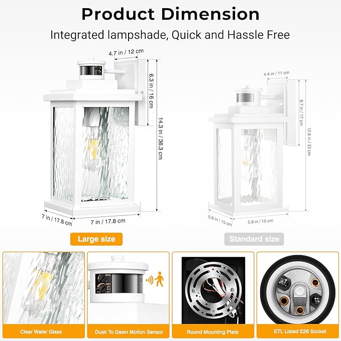 - [One-button Mode Switching & Dual Knob Setting] You can easily switch to ECO or DIM or D2D mode at any time with a touch of the sensing button, and the motion sensors of outdoor lanterns for porch remember your last setting. In addition, you can adjust the porch lights outdoor sensors' detection range or the lighting holding time just by turning a knob. It's easy to enjoy smart, energy-efficient living without having to understand complicated programs.