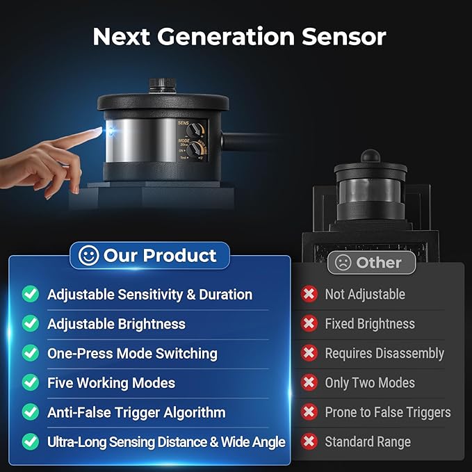 - Advanced Motion Sensor Outdoor Lights: Our outdoor light fixture features a cutting-edge motion sensor with three modes: 1) DIM Mode: Detects motion, illuminating at 100% brightness while reducing to 30% (adjustable between 15%-50%) when idle. 2) ECO Mode: Remains off until motion is detected, then shines at full brightness. 3) D2D Mode: Maintains 100% brightness from dusk until dawn, turning off at sunrise. Enjoy the convenience of automation!