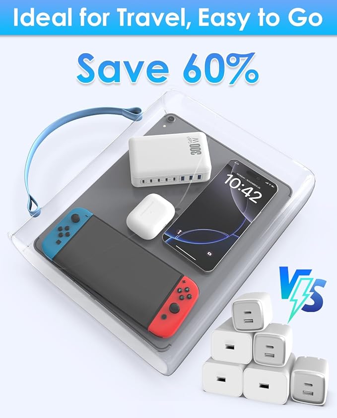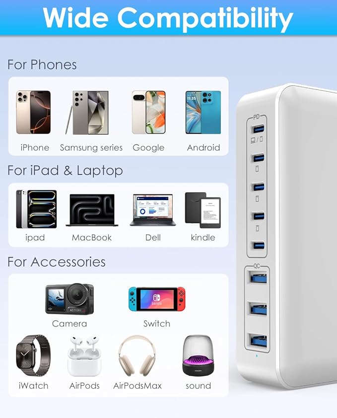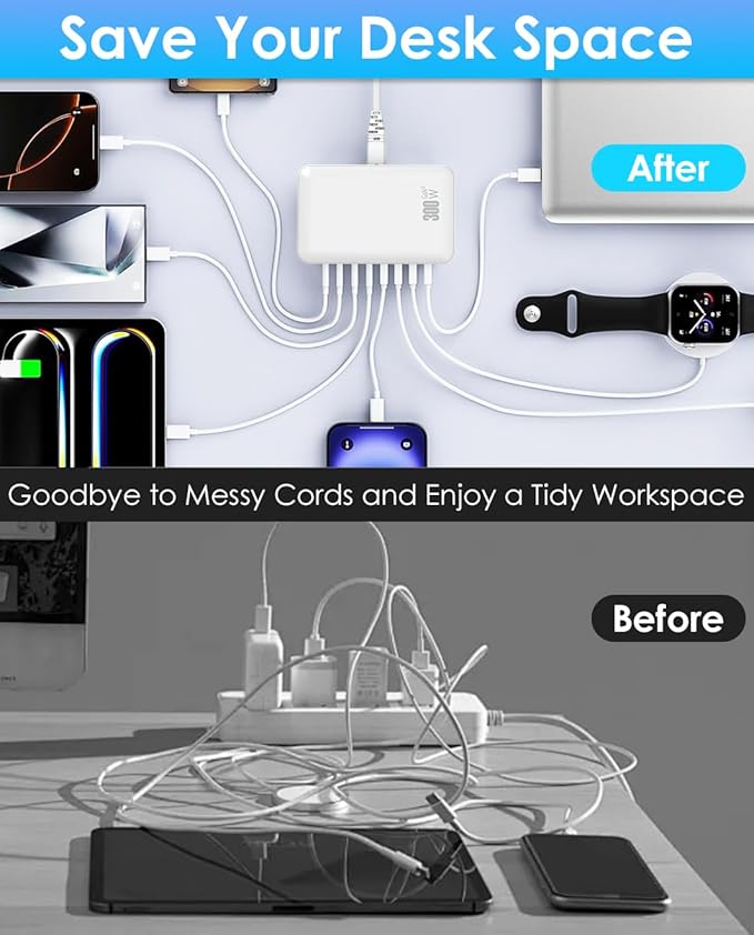 - 【Ultra Fast 300W Output USB Charger Block】: Enjoy the convenience of high-capacity and fast charging with this 300W desktop USB C charger block. Equipped with 5 USB-C and 3 USB-A ports, it allows you to charge multiple devices at the same time. Simply use one usb power strip to provide best power supply for laptops, tablets, smartphones, Bluetooth speakers, and other small gadgets like earbuds, smartwatches, and game consoles it has universal compatibilit.