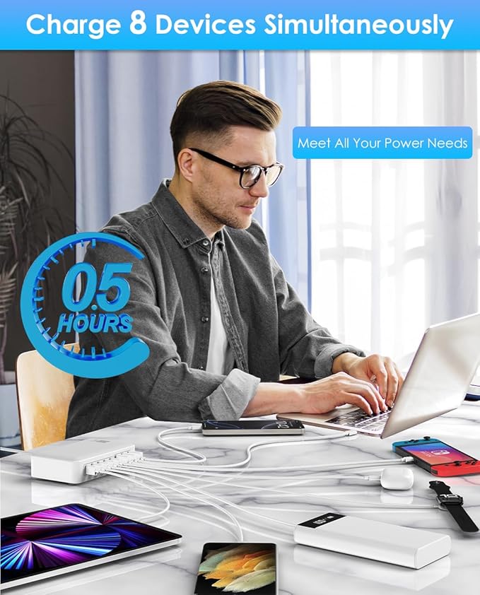 - 【8-in-1 Charging blocks to keep your desktop organized】: The usb charging station can efficiently power multiple devices and reduce clutter at the same time, making it perfect for limited space or sharing spaces, whether you're in the library, conference room, cafe table. No more tangled cables or competing sockets, ample multi ports make it an essential decluttering accessory for collaboration environments.