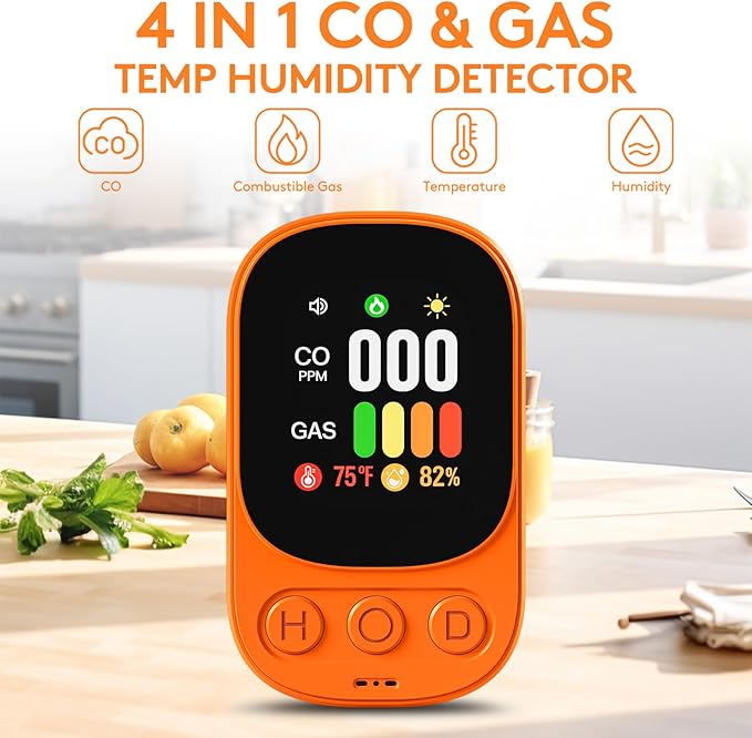1-Pack 4-in-1 Carbon Monoxide Detector Plug in - Real-Time Gas, Temp & Humidity Detection, Clear Alerts, Compact Design Orange