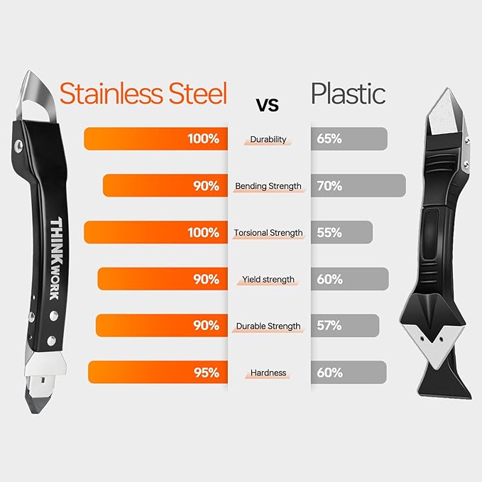 - New design and upgraded : This stainless steel caulking tool is designed as a 4-in-1 tool, made entirely of stainless steel which is highly sturdy. It also has a newly upgraded stainless steel handle that is less prone to breaking.