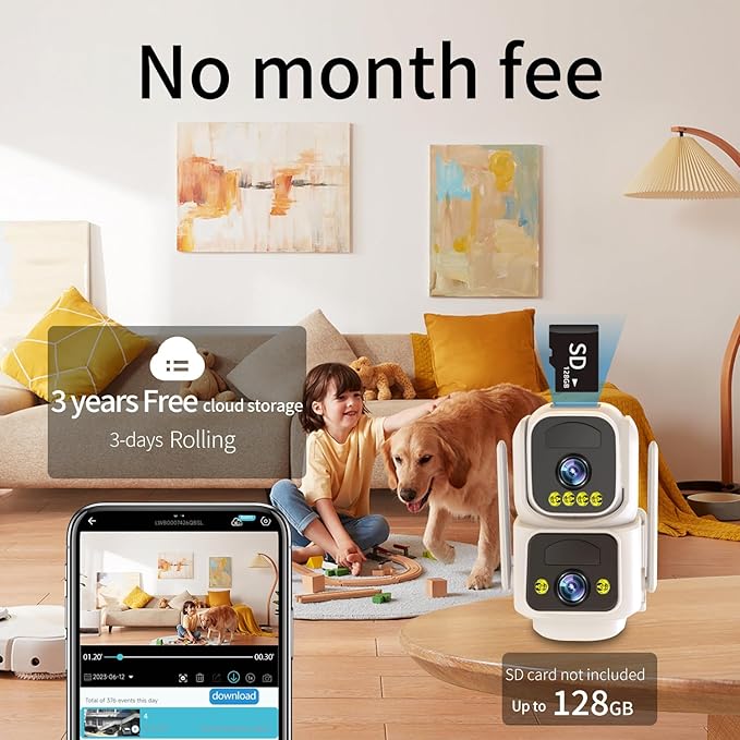 - 【1 Device = 2 Cameras,2*2K Ultra HD Resolution & Color Night Vision】Security Cameras Wireless Outdoor has two lens. 2 lens view cover 360°,Each lens is 3MP/2K with sharper colors and details, allowing you to see everything that is happening within your surveillance area. One camera but function as 2. The camera is built-in 8 leds, the light could be set to motion triggle on or always on at night or close,and when the lights are on at night, extraordinary color night vision adds a glow to every dark night.