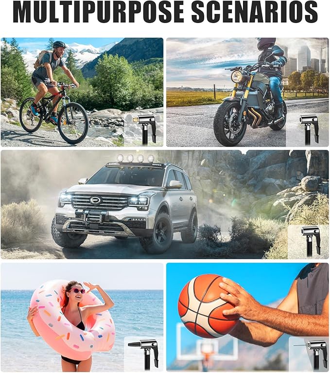 - [Multipurpose] This portable tire inflator is suitable for inflation of car tires, bike & motorcycle tires, sport balls, and inflatable pool toys, etc. For car tires, the max working pressure is 50 PSI and we don't recommend using it to inflate a car tire larger than 245mm. It is NOT applicable for commercial vehicles, trucks, large caravans, motor lorries or large-volume inflatables