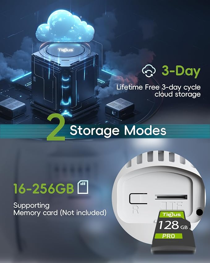- [ 2K HD Resolution & 3 Days Free Cycle Cloud Storage ] - Security cameras wireless outdoor with 2K HD wide-angle lens for 4x digital zoom,Tiejus home security cameras provides free 3-day rotating cloud storage without paying monthly fees. Cloud storage with encrypted secure data and privacy protection or 16-256GB Memory card (Not included) support
