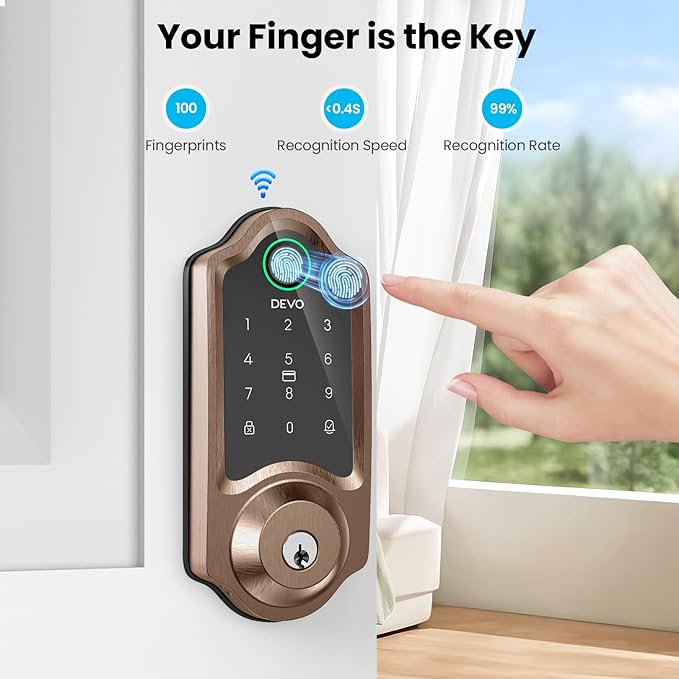 DEVO G8 Fingerprint Smart Lock, Keyless Entry Door Lock with Doorbell, Built-in Wi-Fi Deadbolt, Smart Door Lock for Front, APP Remote, Auto-Locks,Easy Install, IP54 Waterproof