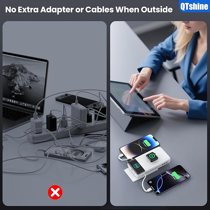 - Charger 5 devices simultaneously: The portable battery is designed with 5 outputs:2 Cables outputs,USB-C and USB-A outputs ports and additional charging output for Apple Watch. Built-in over temperature, short circuit and 10 protection to ensure you use the product safely.