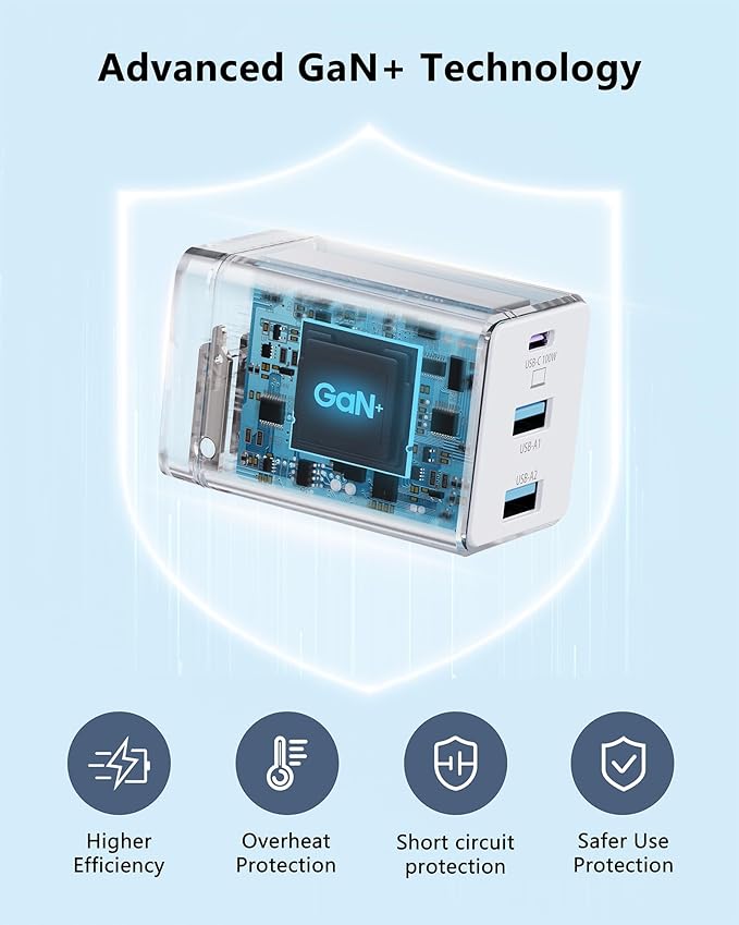 - GaN Ultra Chip Technology for Efficient and Safe Charging: GaN Ultra Chip Technology for Efficient and Safe Charging: Our USB C GaN charger features advanced GaN Ultra chip technology, providing fast and efficient charging in a compact design. With up to 95% energy efficiency, it includes multiple protection features-flame retardant, over-current, over-voltage, overcharge, overload, overheat, and short circuit protection-ensuring complete safety for you and your devices.