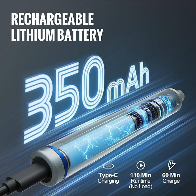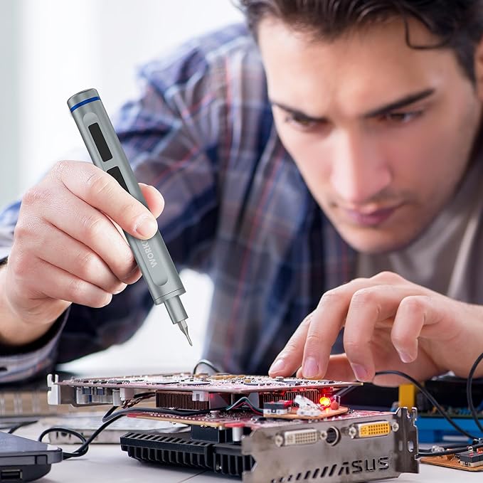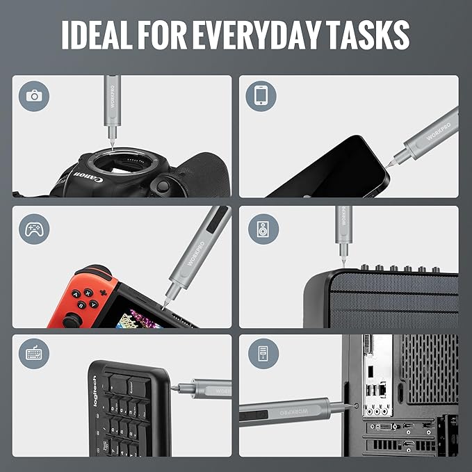 - Powerful & Long-lasting: WORKPRO mini electric screwdriver comes with a strong motor delivering up to 175 RPM speed, max. 0.3 N·m torque in electric mode and max. 3 N·m torque in manual mode. Powered by a 3.7V 350mAh lithium-ion battery, the precision screwdriver can tighten up to 410 screws on a full charge, making electronic repair tasks a breeze