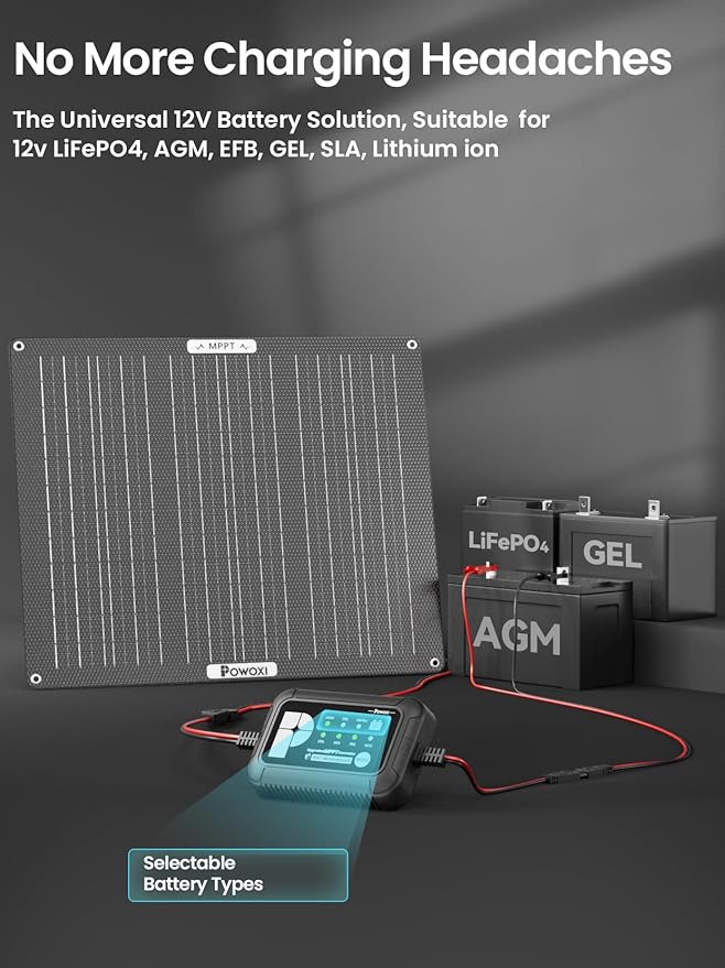 - Enhanced Independent MPPT Controller: POWOXI's innovative IP67 potted technology ensures your solar trickle charger can handle any wet environment. It intelligently adapts to your battery's temperature across different seasons, delivering the precise charging voltage needed. With a three-stage charging process (Bulk, Absorption, Float), it recognizes and applies the perfect voltage for every battery phase, providing more effective 12V battery charging, superior safety, extended battery life, and enhanced charging performance