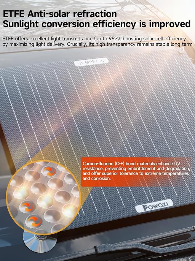 - ETFE Anti-solar refraction Material: ETFE's exceptional light transmittance (up to 95%) significantly enhances solar cell efficiency by optimizing light delivery, making it perfect for a solar car battery charger and solar trickle charger for car battery 12V applications. Its high transparency is maintained long-term, while robust carbon-fluorine (C-F) bonds provide superior UV resistance, preventing embrittlement and degradation, and ensuring excellent tolerance to harsh temperatures and corrosion