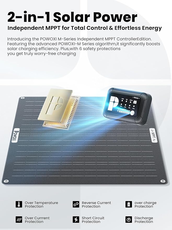 - Stronger & More Long-lasting: Experience effortless energy with the POWOXI M-Series Independent MPPT Controller Edition. Its 2-in-1 design and advanced POWOXI-M Series algorithm significantly boost solar charging efficiency. Enjoy worry-free charging with more comprehensive safety protections: over-charge, over-discharge, over-voltage, over-current, over-load, short circuit, polarity inversion, and over-temperature, all within a waterproof and spark-proof build that fully protects your battery