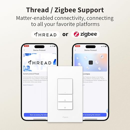 - Thread/Zigbee Protocol: Aqara smart dimmer switch H2 supports matter-over-thread and zigbee, ensuring compatibility with major third-party platforms such as Apple Home, Google Home, Alexa, SmartThings, and Home Assistant. In Zigbee mode, users can access the full range of Aqara Home features, including dimming range,indicator light setting,On/Off transition settings,brightness adjustment increment