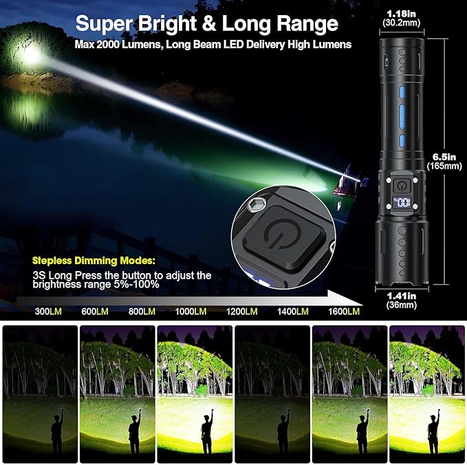 - Type C USB Rechargeble & Power Digital Display:This Rechargeable Tactical Flashlight have USB Type C port for 2.5Hr Fast charging, and USB output Port used as emergency powerbank to charge your phone , GPS, Camera , a good helper during in your camping trip or emergency use, sametime this rechargeable LED Flashlight equipped a Power digital display make it easy to know exactly how much power is left when using the flashlight.
