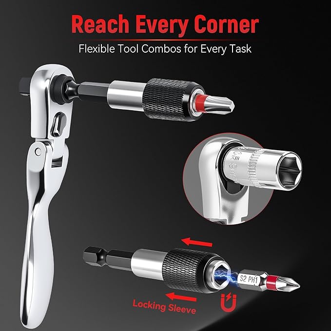 - 2-in-1 Flex Head Ratchet for Tight Spaces: The mini ratchet set features a dual-head design—1/4" square drive + 1/4" hex bit holder—for fast switching between sockets and bits. Its 180° pivoting head gives easy access in hard-to-reach or angled areas.
