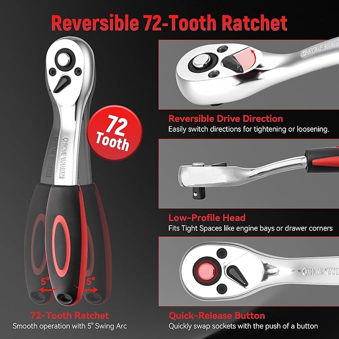 - Compact & Travel-Friendly: Stored in a compact folding case (7.87" × 2.68" × 1.7"), lightweight, space-saving, this socket wrench set fits easily in toolboxes, glove compartments, or drawers—ready for any job, anywhere.
