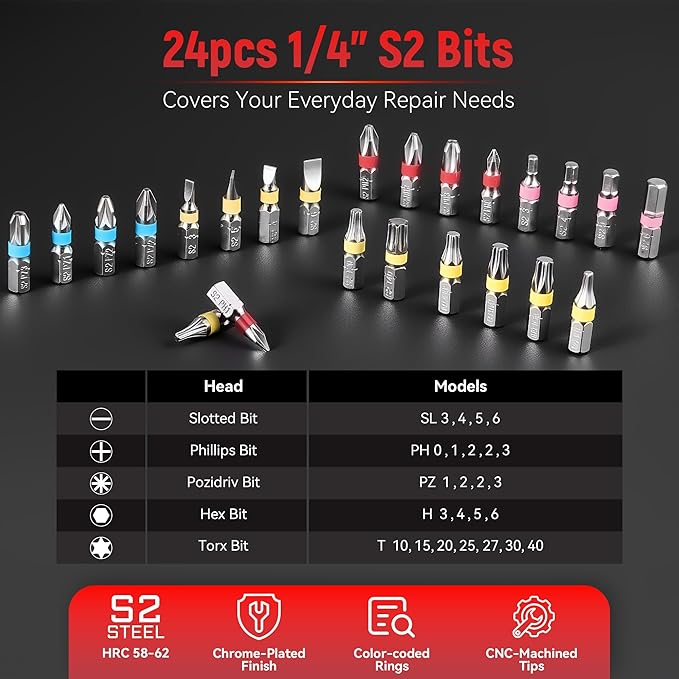 - Durable & Built to Perform: Bits are CNC-machined S2 steel, color-coded for quick ID. Sockets are made of heat-treated Cr-V steel with a rust-resistant, polished finish—built to last through tough jobs.