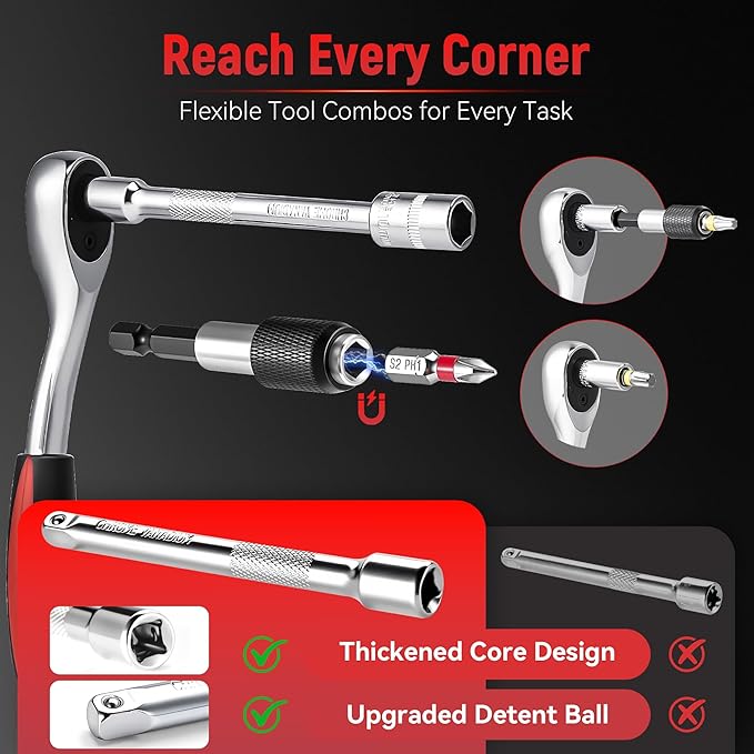 - Made for Tight Spaces: The mini ratchet set features a 72-tooth gear with a 5° swing arc for smooth performance in confined areas. Use with the extension bar or magnetic bit holder to access hard-to-reach spots effortlessly.