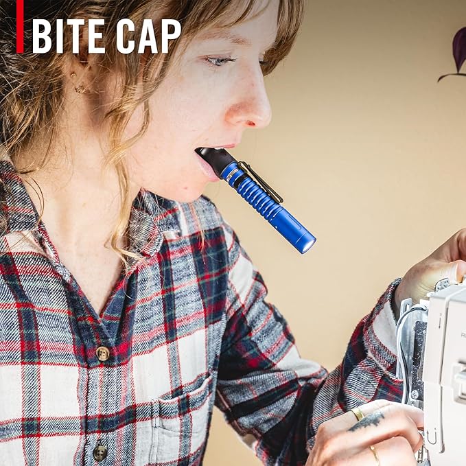 - TWO-WAY POCKET CLIP & RUBBER BITE CAP: A stainless-steel two-way pocket clip secures the light when not in use and doubles as a hands-free mount for the bill of a hat. For those moments when you want to hold the light in your mouth, we designed a durable rubber bite cap that fits onto the end of the flashlight—for better grip and to protect your teeth.