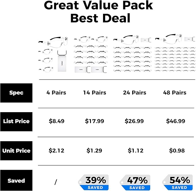 - Compact Protective Storage: A drawstring pouch for each pair, offering safe and compact on-the-go storage. Easily attaches to belts, tool racks, or bicycles, keeping lenses clean, scratch‑free, and protected—extending their usable life.