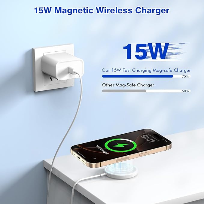 - 15W Portable Wireless Charger iPhone:with a 20W USB C Power Adapter,the Apple magnetic charger for iPhone supports up to 15W fast magnet charging speed for your iPhone 16/iPhone 15/iPhone 14/iPhone 14/iPhone 12 Series,fast charging your iPhone 14 to 50% in just 30 minutes and from 0 to 100% in just 2-2.5 hours, 3X faster then the original 5W iPhone Charger