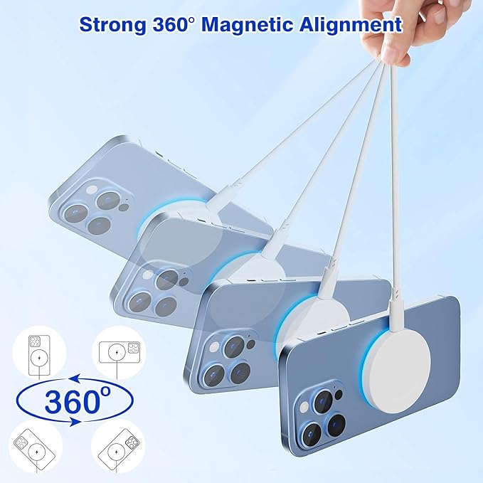 - Magnetic,Stable 360° Adsorption Mag Safe Charger:Magnetic iPhone Charger firmly holds your iPhone while charging,no sliding or falling off, provides you a fast,safe and charging experience.The iPhone wireless charger fast charging pad features auto-alignment technology and a robust magnetic hold to ensure that your iPhone stays securely in place while charging