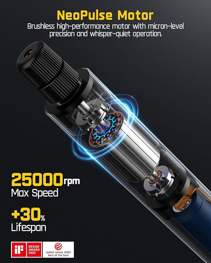 - Whisper-Powerful: The Fanttik F2 Master features a brushless hollow cup motor that reduces noise by 30% compared to standard motors. Maximum speed: 25,000 RPM, it delivers stronger performance and less heat. 5 adjustable speed settings make it easy to handle various precision tasks