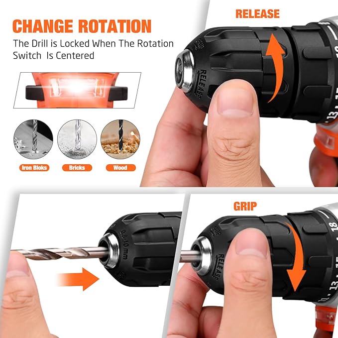 - 12V Cordless Power Drill: Equipped with a 1.5Ah rechargeable lithium-ion battery, delivering a max speed of 1500 RPM. It features integrated LED lighting for working in dark areas, dual-speed control, and a 3/8-inch (10mm) keyless chuck, making it versatile for various applications. While the ergonomic handle ensures comfort during extended use.