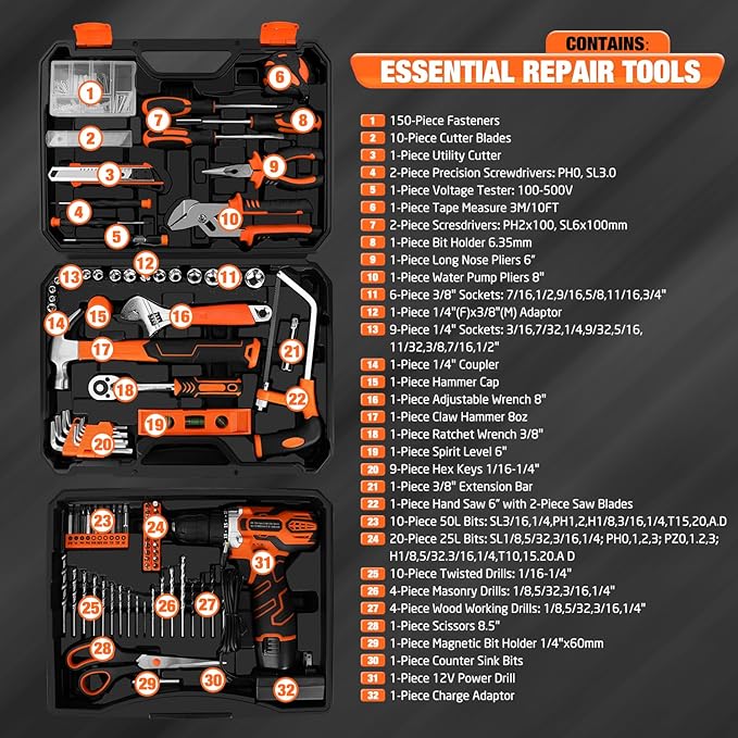 - Upgraded High-Capacity portable Toolbox: Unlike standard toolkits, this set features a removable sliding drawer and tiered storage compartments, maximizing space efficiency. Constructed with a durable plastic casing and secure latches, it safeguards tools during transport, making it perfect for home workshops or outdoor repairs.