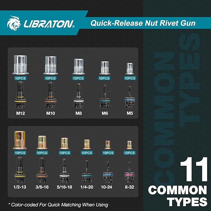 - 【EASY TO USE】The rivet nut tool kit includes replaceable mandrels and nozzles of various sizes: Metric: M5, M6, M8, M10, M12; SAE: 8-32", 10-24", 1/4-20", 5/16-18", 3/8-16", 1/2-13", 10 nuts each of 11 specification, and a blow molding storage box, allowing for adapt to nuts of different specifications.