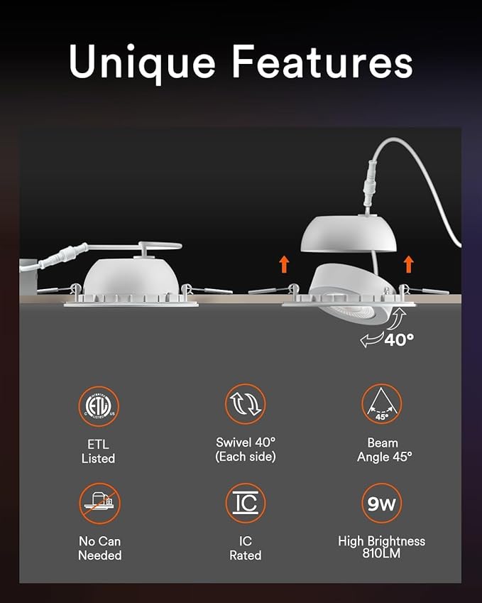 - 40° Tilt Adjustable: Easily direct the light precisely where you need it with this 40° tilt eyeball light. Whether for highlighting art, illuminating workspaces, or setting a cozy mood, it adapts effortlessly to your needs. Suitable for challenging spaces like vaulted ceilings, sloped ceilings, soffit, and lofts, etc