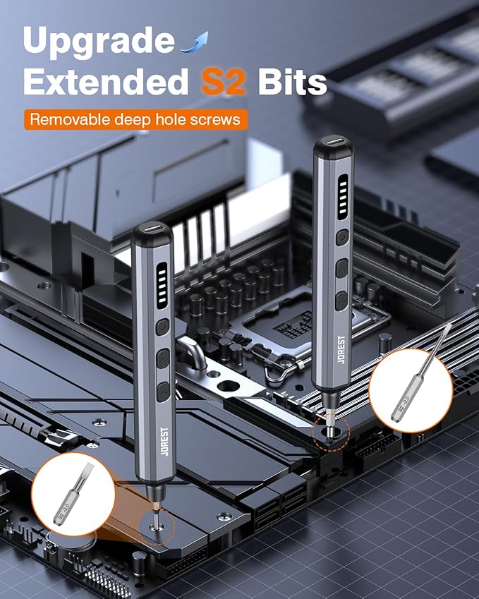 - 【Efficient and Convenient】JOREST precision electric screwdriver set has 5 adjustable electric gears level—different gears correspond to different torque(0.05 N.M, 0.09 N.M, 0.12 N.M, 0.15 N.M, 0.2 N.M)—and manual torque of 5 N.m, so that this set of tools can precisely meet your torque requirements for repairing different items. Equipped with 4 embedded LED lights to illuminate your work area, making it easy to operate in dark places.