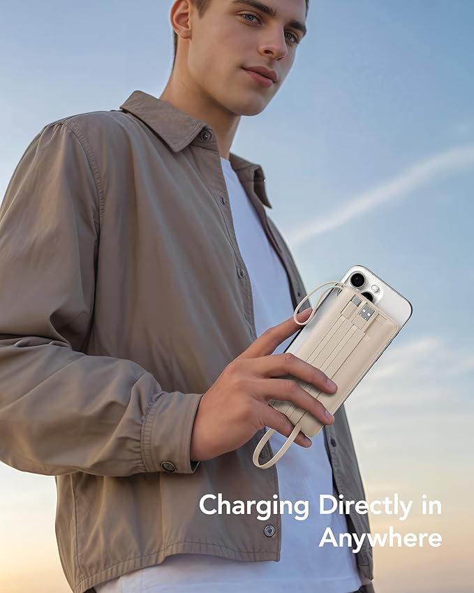 VRURC Portable Charger Power Bank,10000mAh Travel Essentials Battery Pack, 5 Outputs 2 Inputs Slim USB C Charging Bank Built-in Cables Cords Compatible with iPhone,Samsung,Android-Light Coffee(1 Pack)