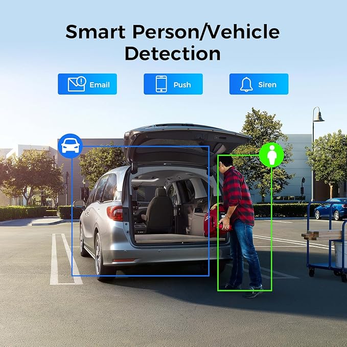 - 【AI Smart Security with Alarm Alerts】 Innovative camera systems with one-way audio & alarm light. Advanced AI distinguishes humans/vehicles from other objects and detects perimeter intrusions. Smart detection activates alarm light only on human detection (supports up to 4 channels) with instant free app alerts – no monthly fees.
