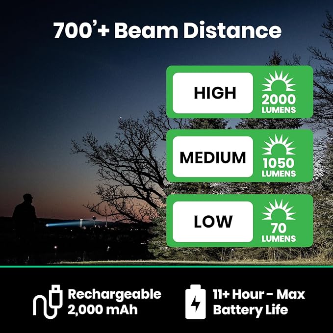 - Powerful 2000 Lumen Output: This flashlight with magnetic base features 3 brightness levels—2000, 1000, and 70 lumens—ideal for any environment or task.
