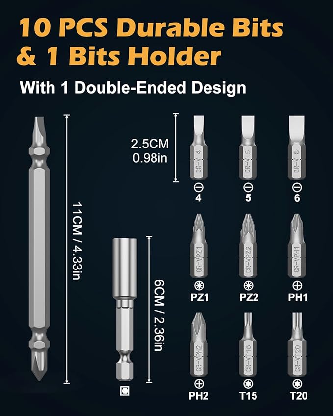 - 【10-Piece Magnetic Bit】Features 9 short bits and 1 dual-end long bit, optimized for common screws (Phillips, slotted, hex, etc.). Aluminum alloy tail withstands light tapping to make the screws more stable. (Note: Not a hammer substitute)