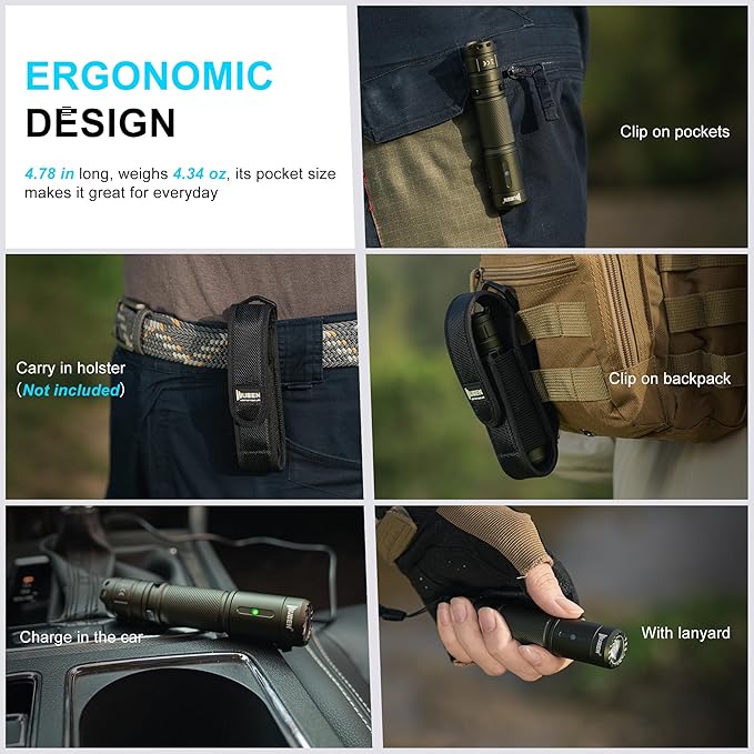 - Best for Everyday Carry: The pocket flashlight is 4.78 in long, weighs 4.34 oz, its pocket size makes it great for everyday carry. The pocket clip and lanyard of the flashlight make it very convenient to carry with you. And there is optional flashlight holster in our store, multiple ways for carrying to choose