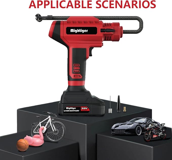 - Dual Power Supply: Never run out of power! This portable air compressor works with both a 20V detachable Li-ion battery and 12V car adapter – perfect for road trips and emergencies.