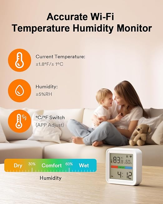 - Precision Matters: Experience dependable accuracy with our advanced smart temperature hygrometer monitor. With ±0.3°C for temperature and ±3%RH for humidity, it delivers data you can trust—ideal for keeping nurseries, bedrooms, and indoor spaces just right. From everyday comfort to optimizing your smart thermostat system, this WiFi temperature sensor helps you stay in control