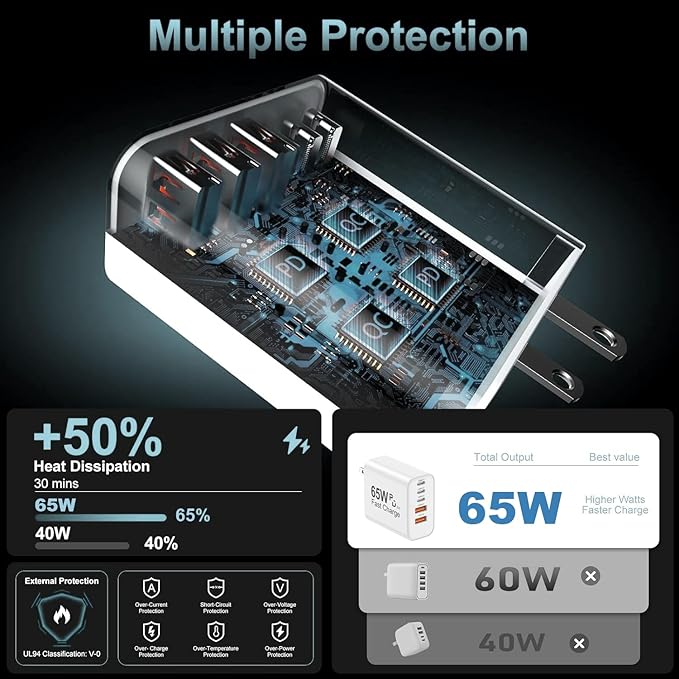 - ๐The USB C Charger supports the Power Delivery and Quick Charge 3.0 fast charging functions with a total power of up to 65W.The USB-A port offers an output power of 3 A/5 V,while the USB-C port offers a charging speed of 20W.Charge your iPhone devices from 0% to 60% in just 30 minutes