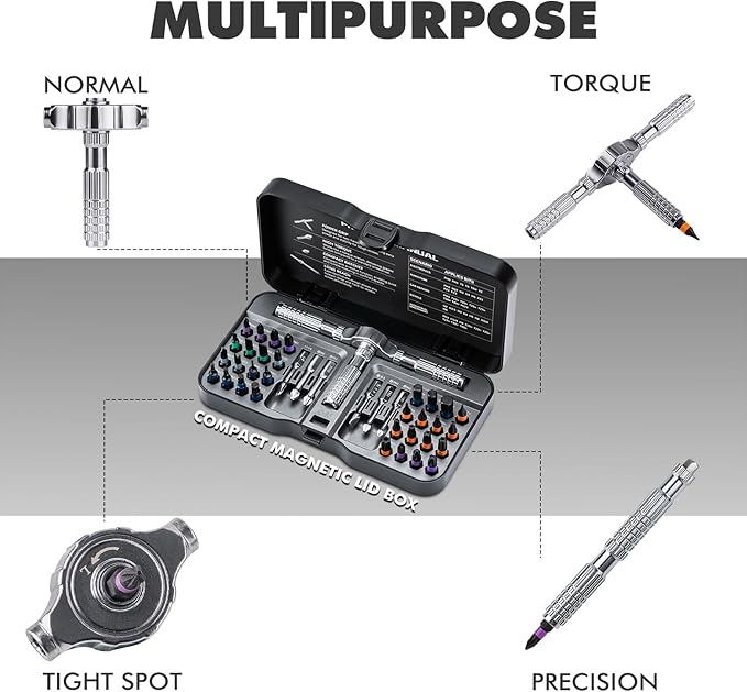 - Powerful Torque – This magnetic screwdriver sets has a maximum torque of 40 N·m and is very durable, perfect for furniture assembly, home appliance repair, precision electronic product repair, bicycle repair, etc. This is a essential tools for professionals and DIY enthusiasts